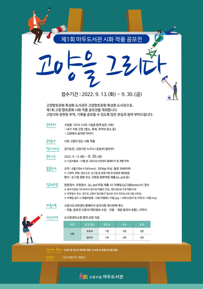 공모전 주제는 ‘고양을 그리다’로, 내가 가본 고양의 명소, 축제, 추억의 장소와 고양에서 살아온 이야기를 시와 그림을 함께 담은 시화 형식으로 담아내면 된다.