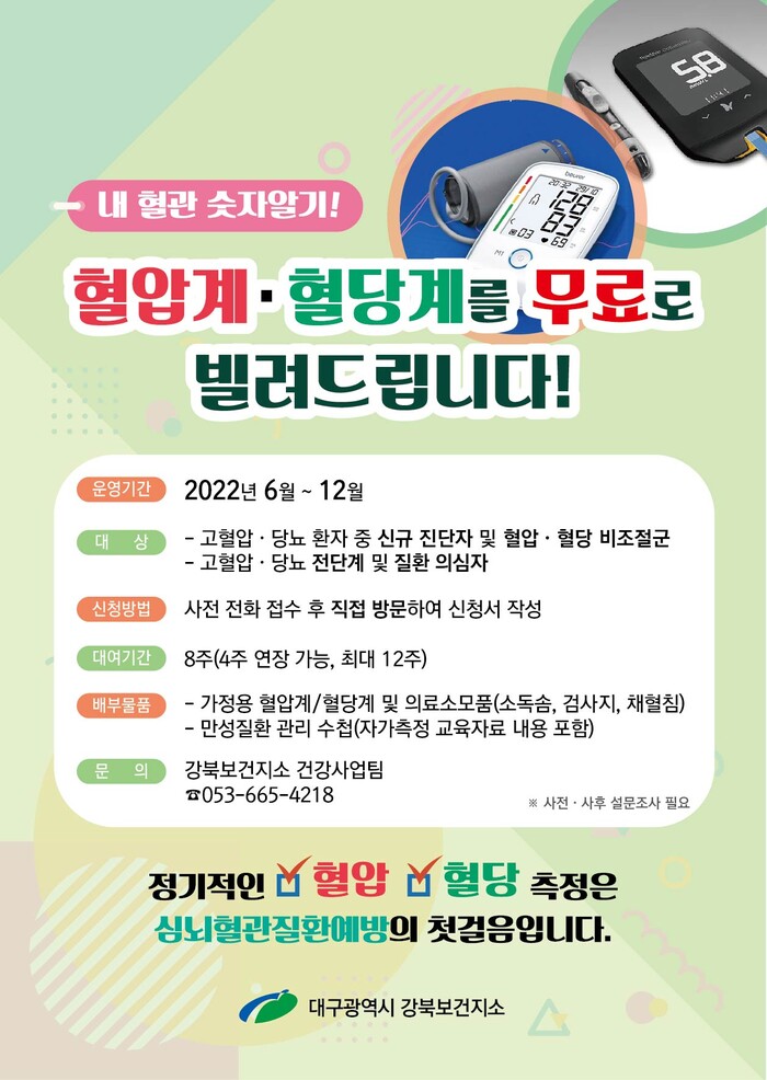 [로컬세계=박세환 기자] 대구 북구보건소(소장 이영숙)는 주민의 심뇌혈관질환 예방을 위해 ‘내 혈관 숫자알기’ 혈압계·혈당계 무료 대여사업을 이달부터 오는 12월까지 추진한다고 3일 밝혔다.