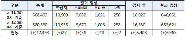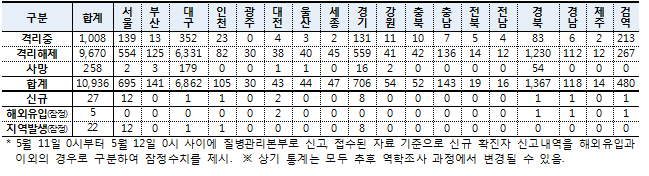 질병관리본부 중앙방역대책본부(본부장 정은경)는 12일 0시 현재, 총 누적 확진자수는 1만936명(해외유입 1138명·내국인 90.3%)이며, 이중 9670명(88.4%)이 격리해제 됐다고 밝혔다.
