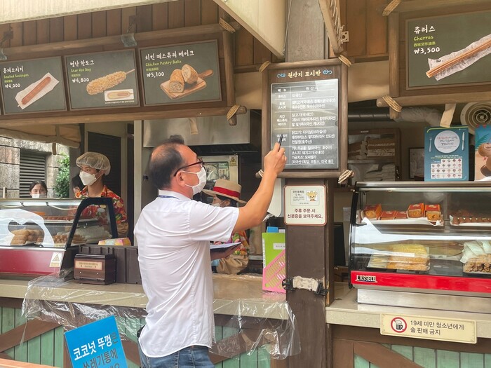 ▲시 단속반이 캐리비안 베이 내 휴게음식점에서 원산지 표시 점검을 하고 있다. 용인시 제공 |
