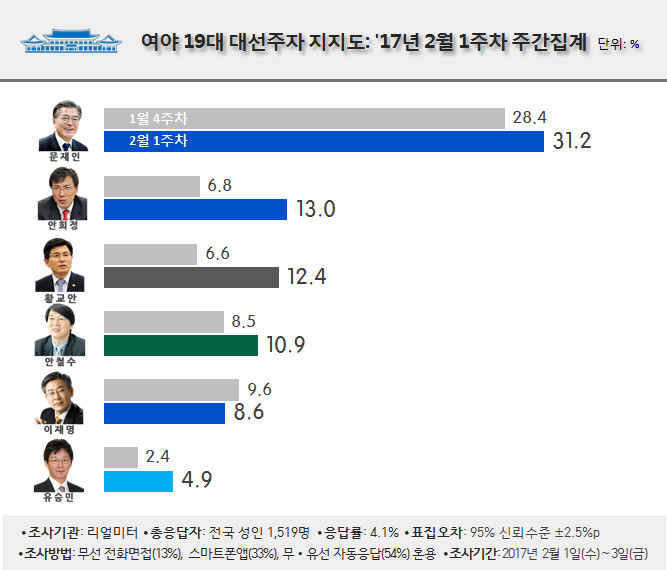 리얼미터가 반기문 전 UN 사무총장의 불출마 선언 이후 실시한 2월 1주차 주간집계(무선 90 : 유선 10 비율, 전국 1519명 조사)에서, 문재인 더불어민주당 전 대표의 1강 체제가 강화되고, 안희정 충남지사와 황교안 대통령 직무대행을 비롯한 2위권 주자들은 오차범위 내 혼전을 벌이고 있는 것으로 나타났다.