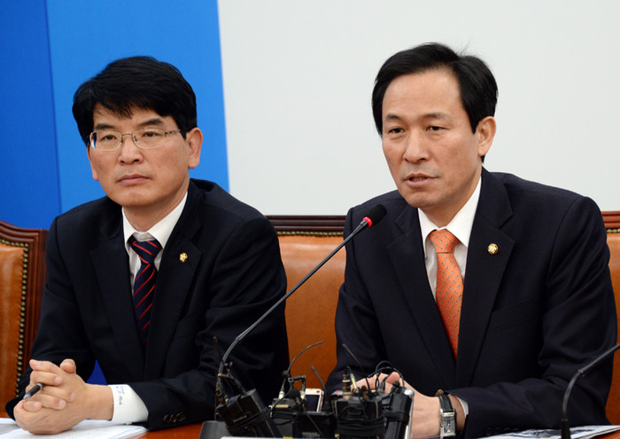 ▲우상호 더불어민주당 원내대표(오른쪽)가 24일 국회 원내대표 회의실에서 박근혜 대통령의 탄핵소추안을 늦어도 12월 9일 국회 본회의장에서 표결되도록 하겠다고 밝히고 있다. 더불어민주당 제공. |