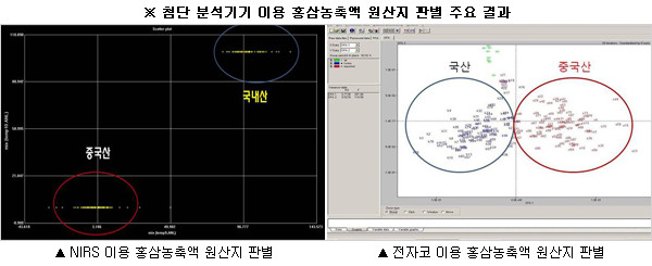 근적외선분광분석기와 전자코를 이용한 원산지 판별 정확도는 100%로 나타났다. 이러한 첨단 분석기기를 이용한 판별은 별도의 전처리 과정 없이 홍삼농축액 원액을 사용해 약 1시간 안에 분석결과가 나온다.