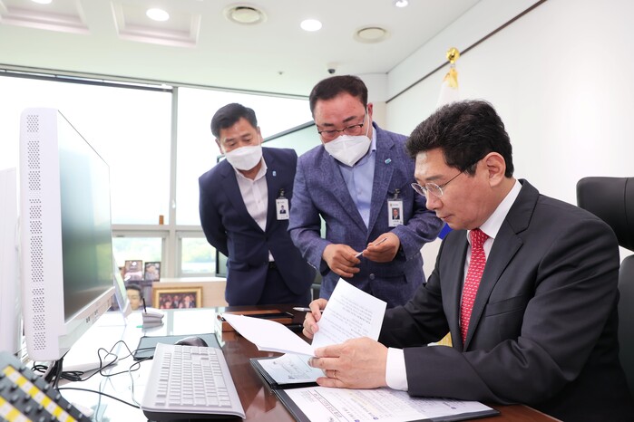 이어 시청으로 복귀해 반도체 기업 집적화를 위한 기반여건 조성, 반도체 소부장 기업 육성을 통한 경쟁력 강화 방안 등 반도체 산업의 발전 전략이 담긴 '글로벌 반도체 중심도시 추진전략'을 첫 번째로 결재했다.