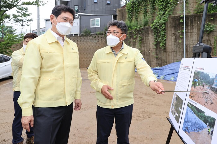 이 시장은 집중호우가 계속된 만큼 이날 예정돼 있던 취임식을 취소했다. 대신 오전 8시 현충탑을 참배한 후 곧바로 관내 수해 현장을 찾아 상황을 점검하고 대책 마련을 지시했다.