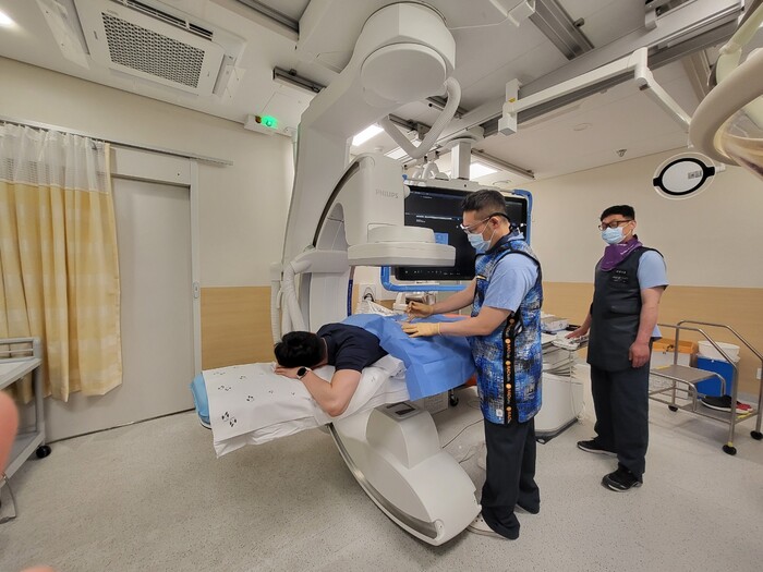 ▲영상의학과 이영준 교수가 척추인터벤션 시술을 시행하고 있다. |