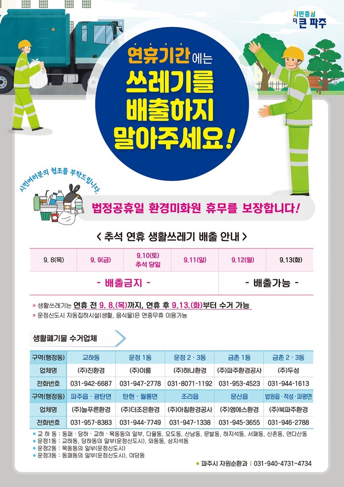 [로컬세계 = 이영원 기자]경기 파주시(시장 김경일)는 환경미화원 휴무 보장을 위해 추석 연휴 기간(9.9.~9.12.)에는 생활 쓰레기를 수거하지 않는다.