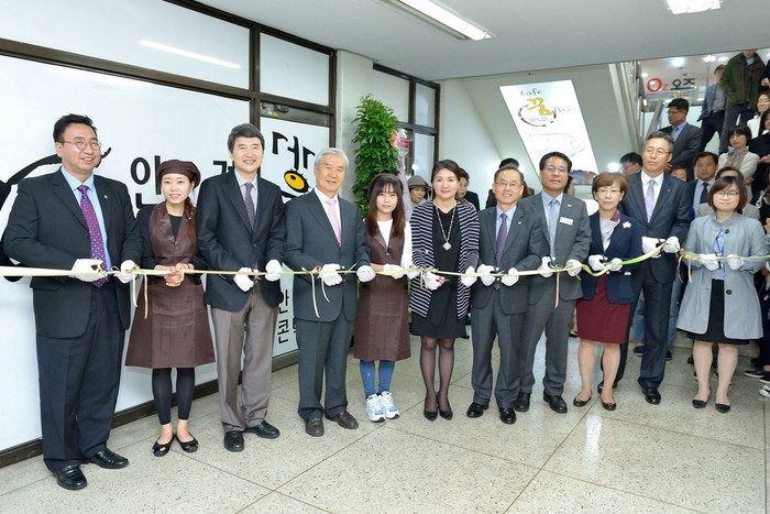 ▲ 다문화카페 '꿈 아시아!' 오픈식에서 내·외빈들이 테이프 커팅을 하고 있다. |