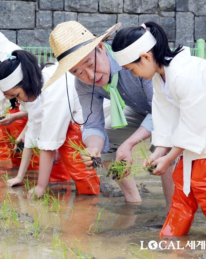 강호동 농협중앙회장은 23일 서울 중구 농업박물관 앞 야외농장에서 어린이들과 함께 못줄을 사용한 전통 모내기 체험행사에 참여하였다.