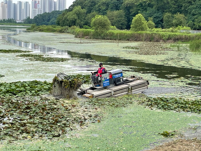 수초제거선 2대(신대호수·원천호수 1대씩)를 활용해 장마철 폭우로 인해 상류에서 내려온 쓰레기 등 부유물(물 위나 물속 등을 떠다니는 오염물질)을 비롯해 수생 식물을 제거하는 작업을 한다.