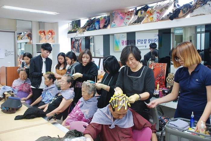 ▲ 대덕대학교 뷰티과 재학생 120명의 재능기부로 보훈가족 50여명을 대상으로 무료 염색 봉사활동이 펼쳐지고 있다. |