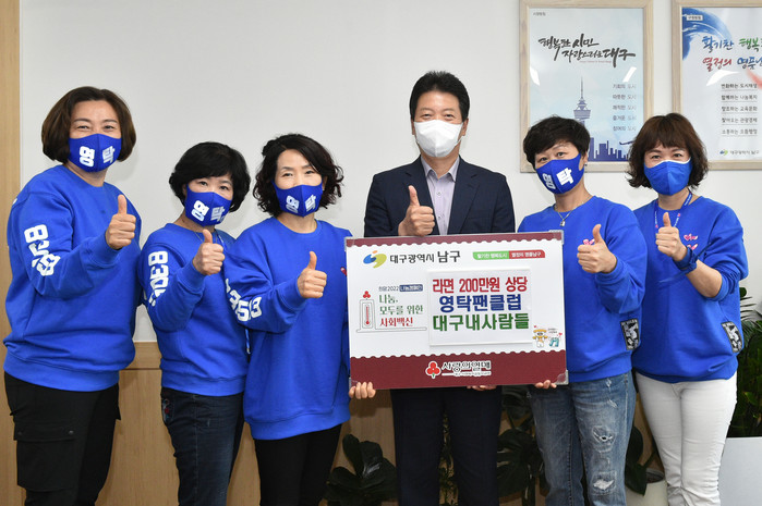 [로컬세계 박세환 기자]대구 남구청은 지난 6일, 가수 영탁 팬클럽 '대구 내사람들'에서 남구청을 방문해 관내 어려운 이웃에게 전달해 달라며 라면(200만원 상당)을 기탁했다고 11일 밝혔다. 이날 전달된 라면은 남구의 생활이 어려운 저소득 세대에 전달될 예정이다.