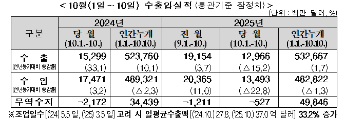 같은 기간 수입은 135억 달러로 22.8% 줄었으며, 무역수지는 5억 달러 적자를 기록했다. 조업일수가 지난해 같은 기간보다 2일 줄어든 점을 고려하면, 일평균 수출액은 37억 달러로 33.2% 증가했다.