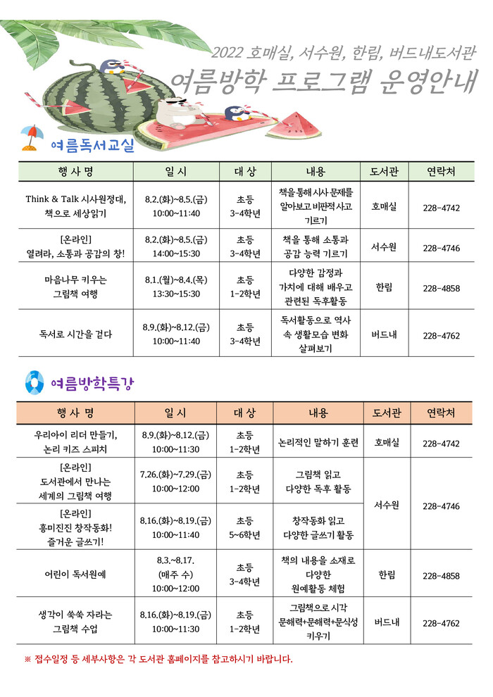 여름방학 특강은 아이들이 논리적으로 말하는 방법을 배우는 ‘우리아이 리더 만들기, 논리 키즈 스피치’, 창작동화를 읽고 다양한 글쓰기 활동을 하는 ‘흥미로운 창작동화! 즐거운 글쓰기!’ 등이 운영된다.