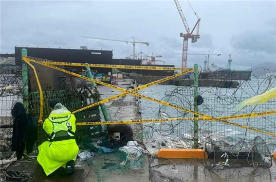 ▲해양경찰이 지난 16일 기상악화에 대비하여 위험구역 출입통제를 하고 있다. 부산해경 제공 |