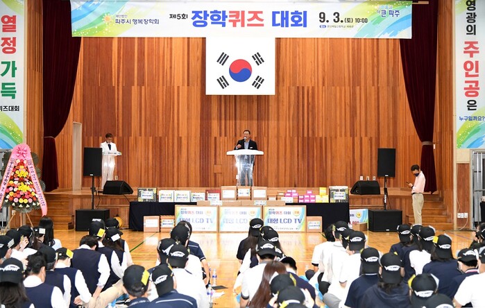 [로컬세계 = 이영원 기자]경기 파주시에서 출연한 (재)파주시행복장학회는 지난 3일 문산제일고등학교 체육관에서 ‘제5회 (재)파주시행복장학회 장학퀴즈 대회’를 개최했다.