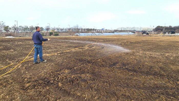 ▲ 경작지에 농업용 유용미생물을 뿌리는 모습. 고양시 제공 |