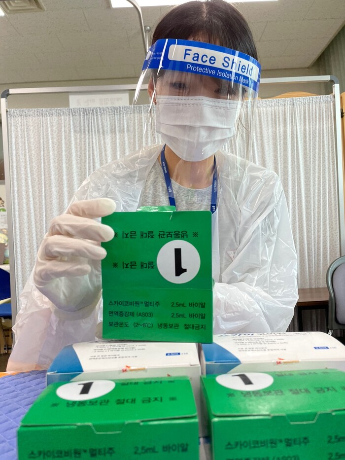 ▲ 처인구보건소 관계자가 국산 코로나 백신인 스카이코비원 백신을 확인하고 있는 모습. 용인시 제공 |