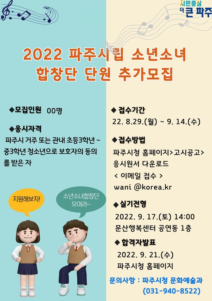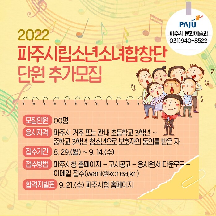 [로컬세계 = 이영원 기자]경기 파주시(시장 김경일)는 오는 14일까지 꿈나무 음악가를 육성하기 위해 ‘파주시립소년소녀합창단 단원’을 공개 모집한다.