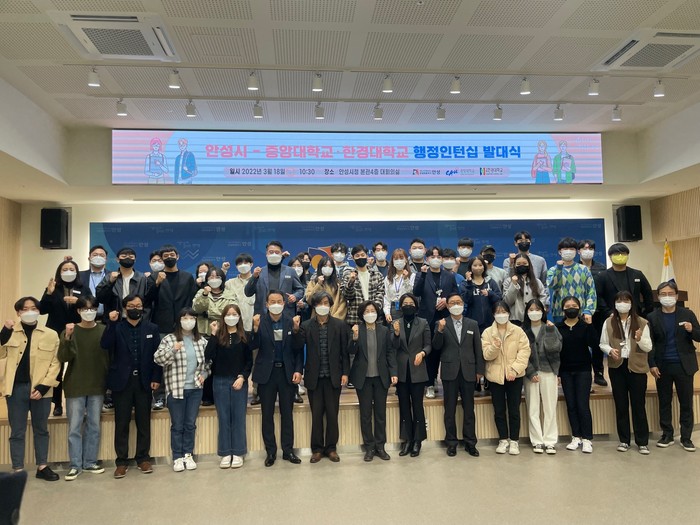 [로컬세계 김병민 기자]경기 안성시는 지난 18일 안성시청 4층 대회의실에서 안성시 공무원 9명과 중앙대학교 학생 29명, 한경대학교 학생 3명이 참가한 가운데, 관학 협력을 통해 참신한 아이디어를 발굴하고 이를 정책으로 반영하는 2022년 상반기 대학생 행정인턴십 발대식을 개최했다고 21일 밝혔다.
