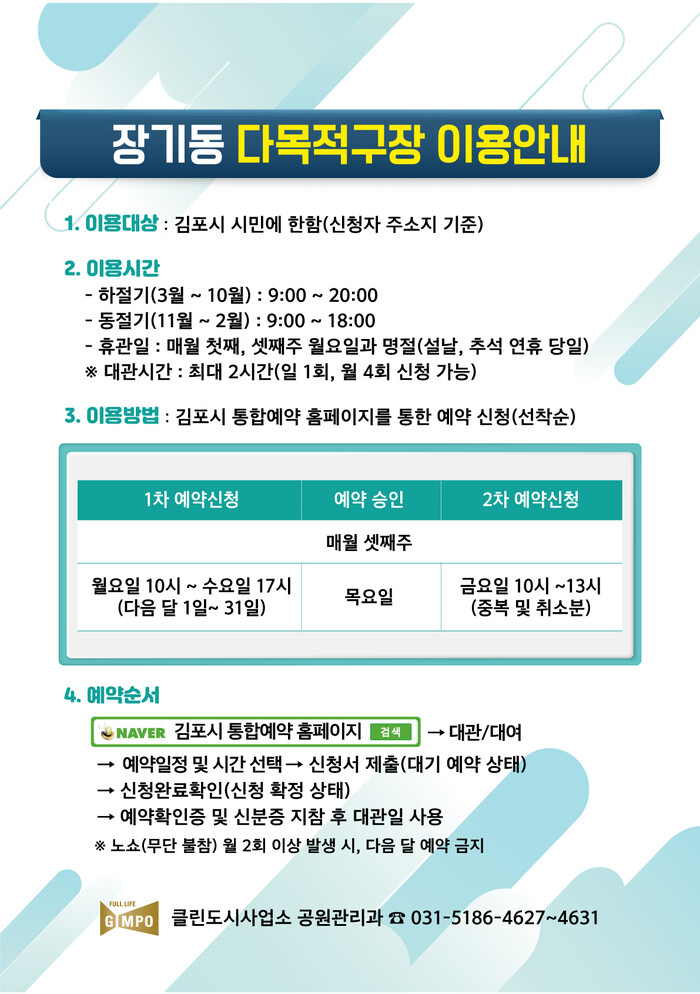 이용방법은 “김포시 통합예약” 홈페이지에서 예약 신청 후 이용 가능하며, 공정한 예약을 위하여 온라인 예약제로 실시한다. 이용시간은 하절기(3~10월) 09:00~20:00, 동절기(11~2월) 09:00~18:00이다. 최대 2시간동안 이용이 가능하며, 매월 첫째, 셋째주 월요일, 설날·추석 연휴 당일은 휴관한다. 매월 셋째주 다음 달 분에 대해 예약 접수하오니 참고해 주시기 바라며, 상세 내용은 김포시 통합예약에서 확인할 수 있다.