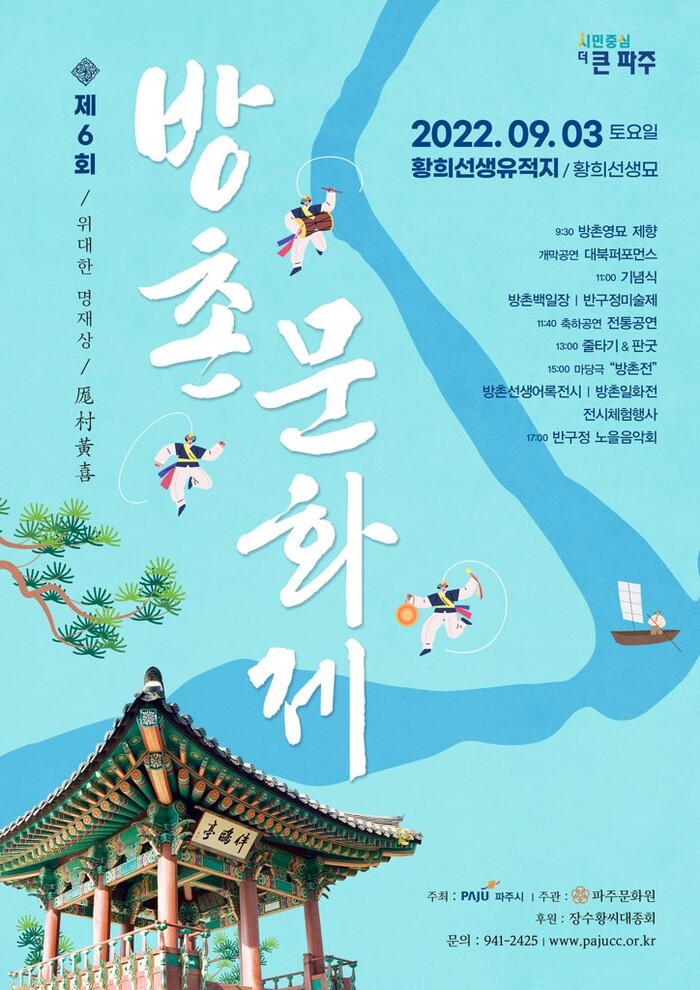 [로컬세계 = 이영원 기자]경기 파주시(시장 김경일)는 오는 9월 3일 황희선생 유적지에서 청백리 방촌 황희 선생의 가르침을 되새기고 이어가기 위한 ‘제6회 방촌문화제’를 개최한다.