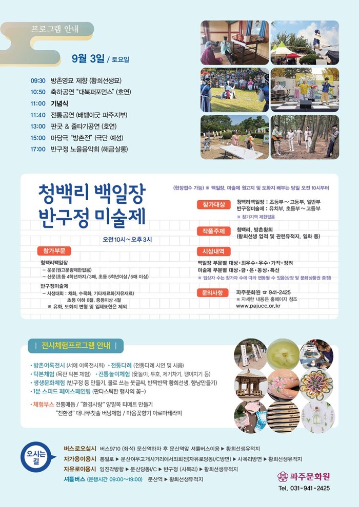 이귀순 문화예술과장은 “황희선생 유적지에서 개최되는 방촌문화제를 통해 선생의 생애를 돌아보고 파주가 역사문화 자원이 풍부한 고장임을 널리 알리는 기회로 삼겠다”고 말했다.