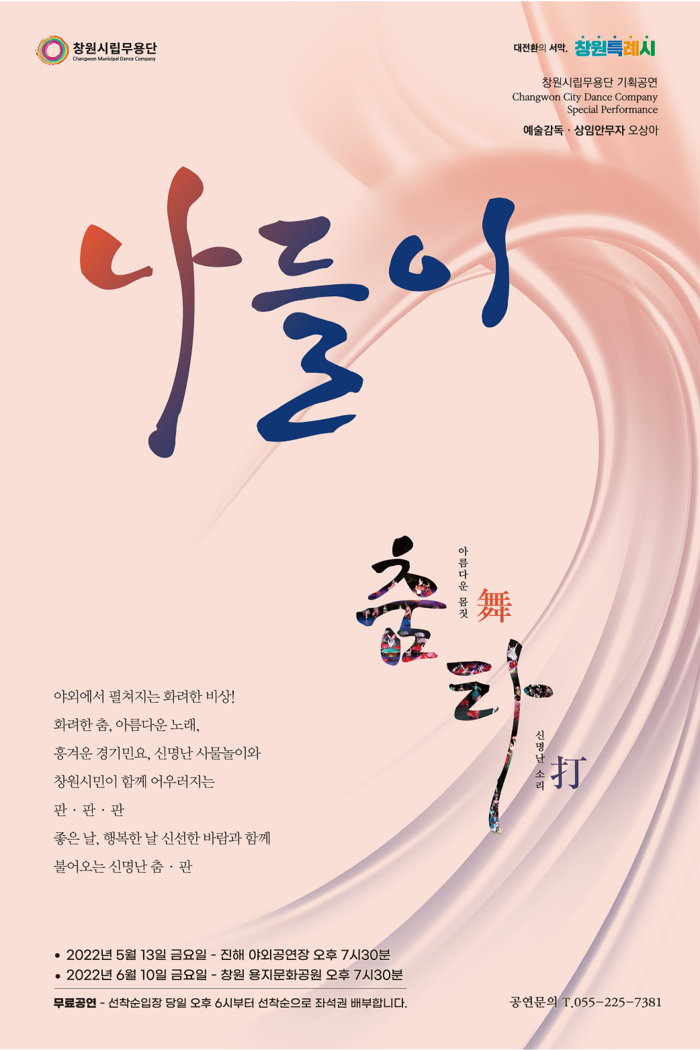 창원시립무용단은 창원시민과 함께 어우러지는 신명의 춤·판을 벌일 예정이다. 오상아 예술감독 겸 상임안무자의 지도와 창원시립합창단과 부산국립국악원의 협연으로 가무악이 지닌 종합예술의 미학을 무대예술로 증폭시켜 공감과 감동을 동시에 선사할 예정이다.