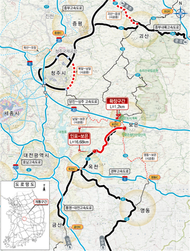 해당 구간은 충청남부 주요지역인 영동·금산·옥천·보은을 연결하는 도로로 지난 2009년 4월 착공을 시작, 사업비 총 3376억원을 투입해 연장 17.88㎞(폭 20.0~26.5m)의 4차로를 건설했다.