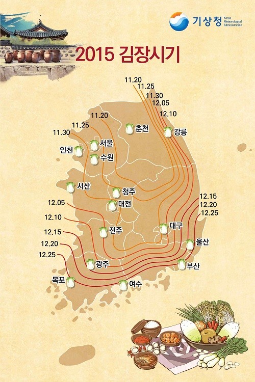 기상청은 오늘(5일) 김장철을 앞두고 ‘2015 김장 적정 예상시기’를 발표했다.