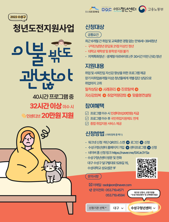 [로컬세계 박세환 기자]대구 수성구(구청장 김대권)는 장기 미취업 청년 등의 구직 및 사회활동 의욕 고취를 위한 ‘2022년 청년도전 지원 사업 참여자’ 300명을 모집한다.
