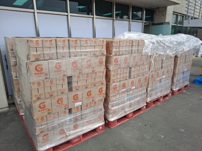 ▲대한적십자사(회장 신희영)와 롯데칠성음료(대표이사 박윤기)는 20일 태풍 힌남노로 피해를 입은 포항시 이재민과 자원봉사자를 위해 이온음료 9,700여병을 적십자사에 전달했다. |