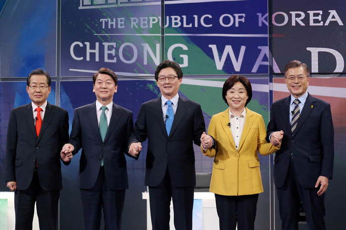 ▲13일 SBS와 한국기자협회 주최로 열린 첫 대통령 후보 초청 토론회에서 홍준표 자유한국당 후보, 안철수 국민의당 후보, 유승민 바른정당 후보, 심상정 정의당 후보, 문재인 더불어민주당 후보(왼쪽부터)가 손을 맞잡고 기념촬영하고 있다. 더불어민주당 제공. |