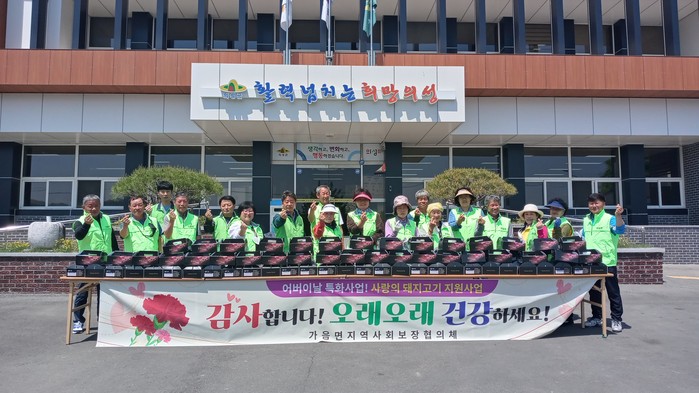 이날 가음면 지역사회보장협의체 위원들이 독거어르신 100가구에 가가호호 방문하여 돼지고기를 직접 전달하고 안부를 확인하며 어버이 은혜에 감사인사를 전했다.