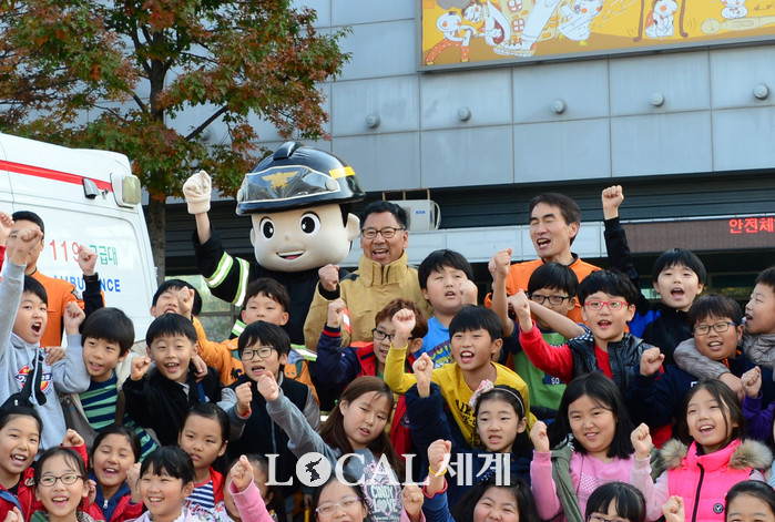 ▲ 7일 서울시의회 강감창 부의장 (가운데)이 완강기 탈출 시범 등 석촌초 학생들을 상대로 재난안전교육을 실시한 후 기념촬영을 하면서 즐거워하고 있다. © 로컬세계 |