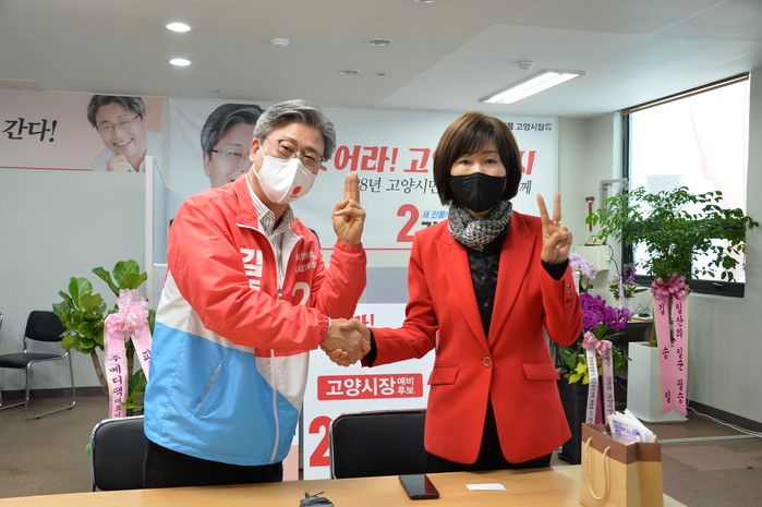 ▲ 권순영 고양시갑 당협위원장(우)과 김종혁 고양시장 예비후보(좌)가 지지선언 후 승리를 다짐하고 있다.(사진=고양시청 연합기자단) |