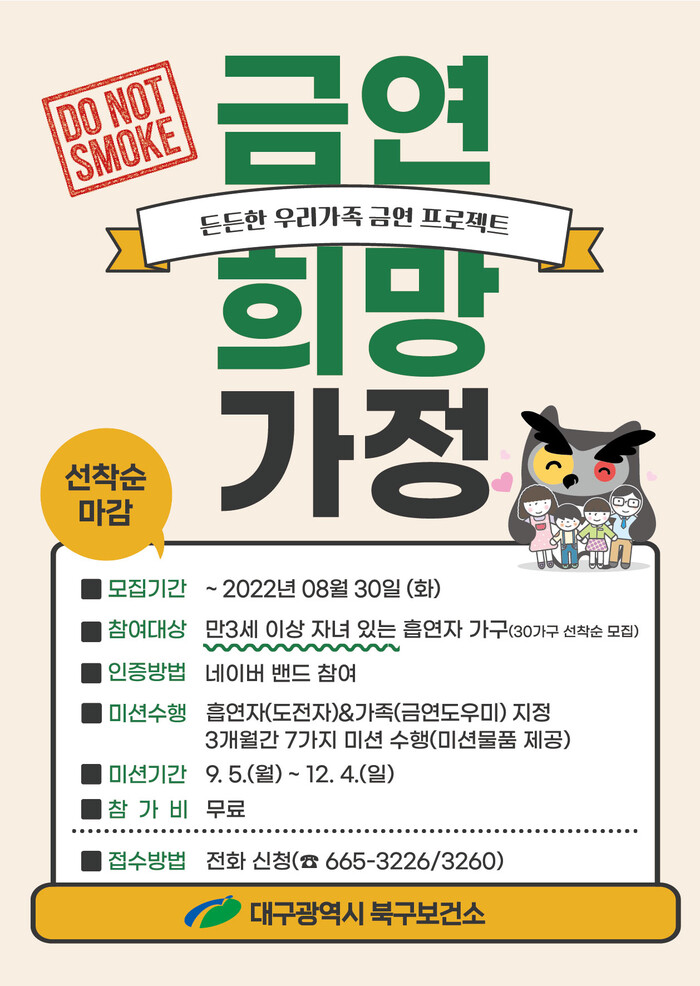 [로컬세계=박세환 기자] 대구 북구보건소(소장 이영숙)는 몇번의 금연 실패로 의지가 약해진 흡연자들을 발굴하여 금연 성공률을 높이고자 가족과 함께하는 ‘든든한 우리 가족 금연 프로그램’을 운영한다.