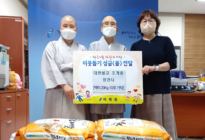 법관사 주지 은성 스님은 “어려운 이웃과 따뜻한 마음을 나누고 싶어 신도들과 뜻을 모아 쌀을 기탁했다”며 “작은 정성이지만 이웃들에게 위로와 보탬이 되길 바란다”고 말했다.