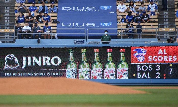 ▲지난 11일 LA다저스 홈경기 중 하이트진로 글로벌 브랜드 'JINRO' 제품 5종이 LED 광고에 나오고 있다. 하이트진로는 2012년부터 11년째 LA다저스와 스폰서십을 유지하고 있다. |