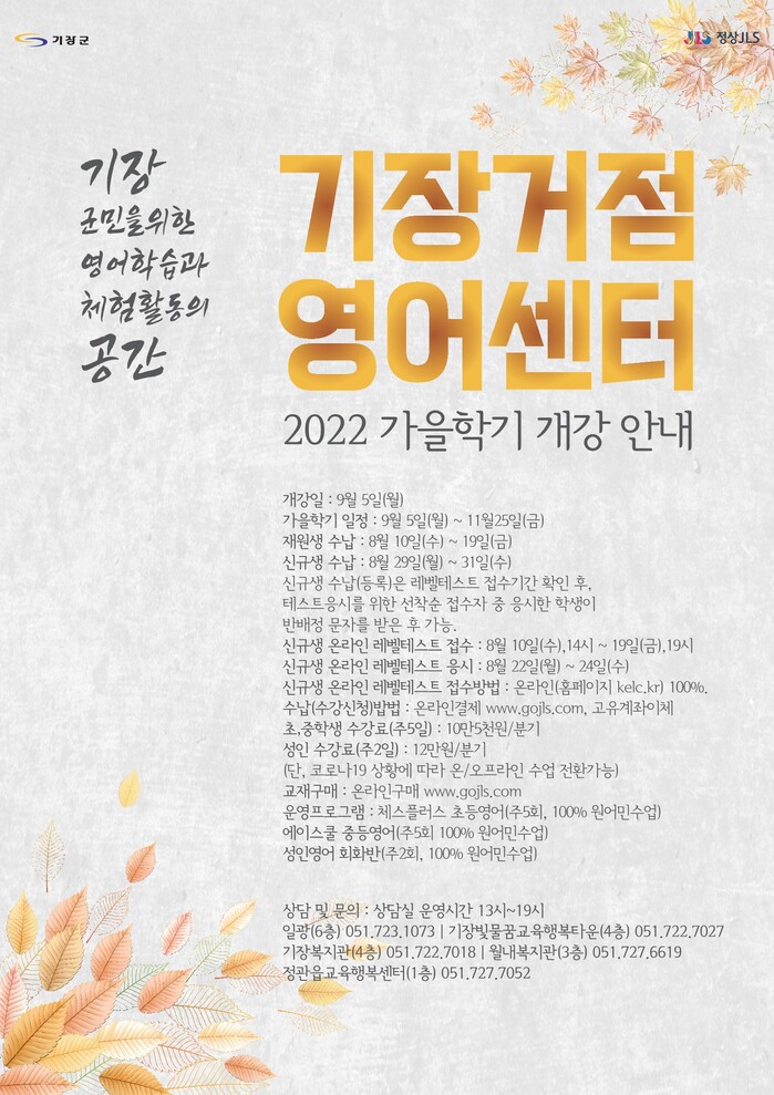 [로컬세계 부산=맹화찬 기자]부산 기장군은 다음 달 5일부터 11월 25일까지 진행되는 기장군거점영어센터(거점영어센터) 가을학기 신입생을 모집한다고 8일 밝혔다.