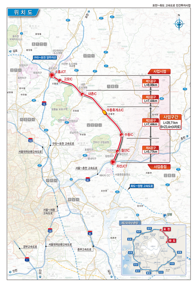 포천-화도 고속도로는 지난 5월 포스코건설 등 12개사로 구성된 수도권 외곽순환고속도로에서 시행하는 민간투자사업으로 민간투자사업 심의위원회를 거쳐 실시협약이 체결됐다.