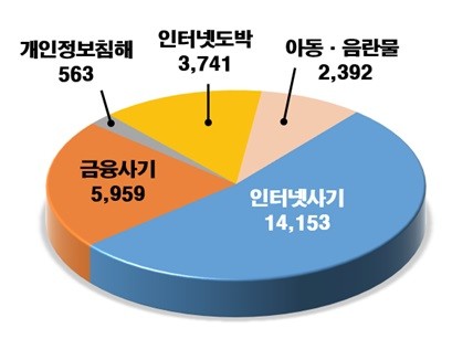 유형별로는 누리망사기 1만4153명(53%), 금융사기 5,959명(22%), 누리망도박 3741명(14%), (아동)음란물 2392명(9%), 개인정보침해 563명(2%) 순으로 나타났다.