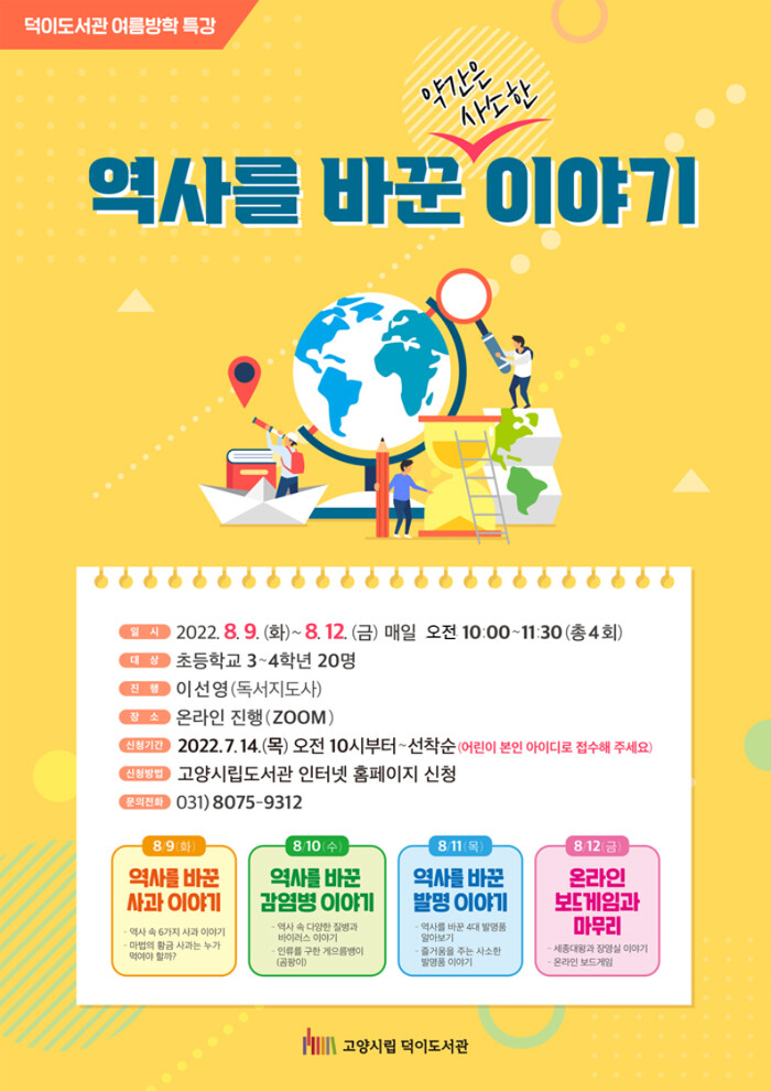 [로컬세계 = 이영원 기자] 경기 고양특례시(시장 이동환) 덕이도서관이 방학을 맞이하는 초등학생을 대상으로 8월 9일부터 8월 12일까지 여름방학특강 ‘역사를 바꾼 이야기’를 운영한다.