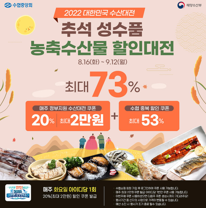 수협중앙회가 운영하는 수산물 전문 쇼핑몰 수협쇼핑이 해양수산부와 함께 16일부터 다음달 12일까지 “대한민국 수산대전(추석 성수품 녹축수산물 할인대전)” 행사를 개최한다.