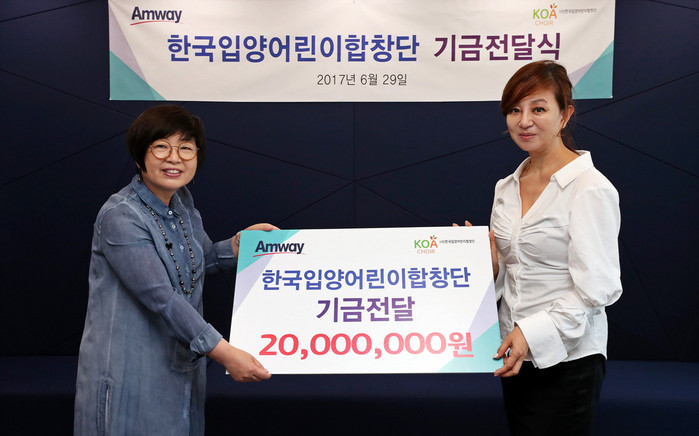 한국암웨이는 29일 오전 서울 삼성동 본사에서 한국암웨이 조양희 부사장, (사)한국입양어린이합창단 김수정 단장 및 관계자 등 총 10여 명이 참석한 가운데, 후원금 2000만원을 전달하는 행사를 가졌다고 밝혔다.