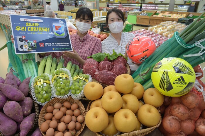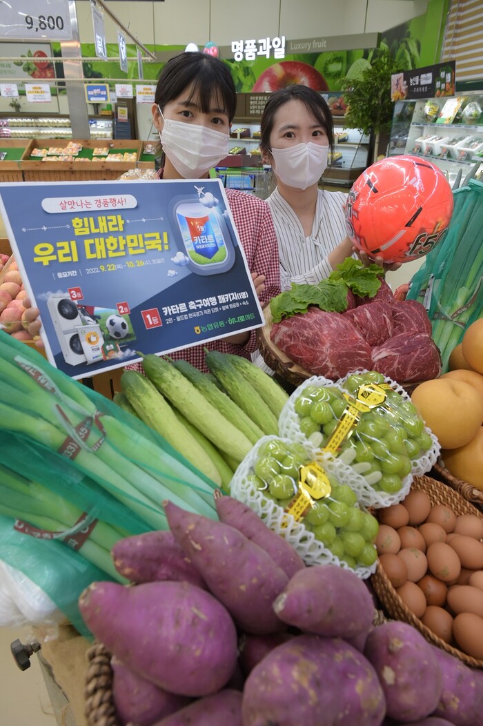 ▲ 21일(수) 서울시 서초구에 위치한 농협 하나로마트 양재점에서 모델들이 살 맛나는 가격으로 판매하는 가을맞이 행사 품목과 카타르 축구여행 패키지 경품 행사를 소개하고 있다. 농협유통 제공 |