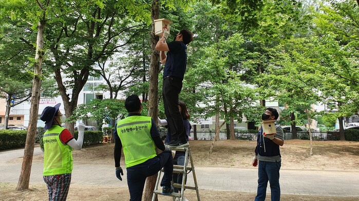 이러한 새들의 보금자리 마련을 위해서 궐동행복마을관리소뿐 아니라 오산시환경사업소 공원녹지과와 오산시설관리공단 15여명이 함께하여 인공 새집 설치 장소를 모색하고 선정하여 진행하였다.