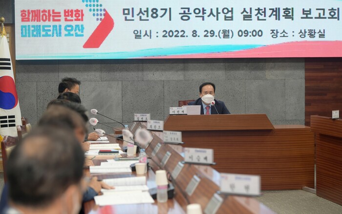 ▲이권재 시장이 29일 열린 '민선 8기 공약사업 실천계획 보고회'를 주재하고 있다. 오산시 제공 |