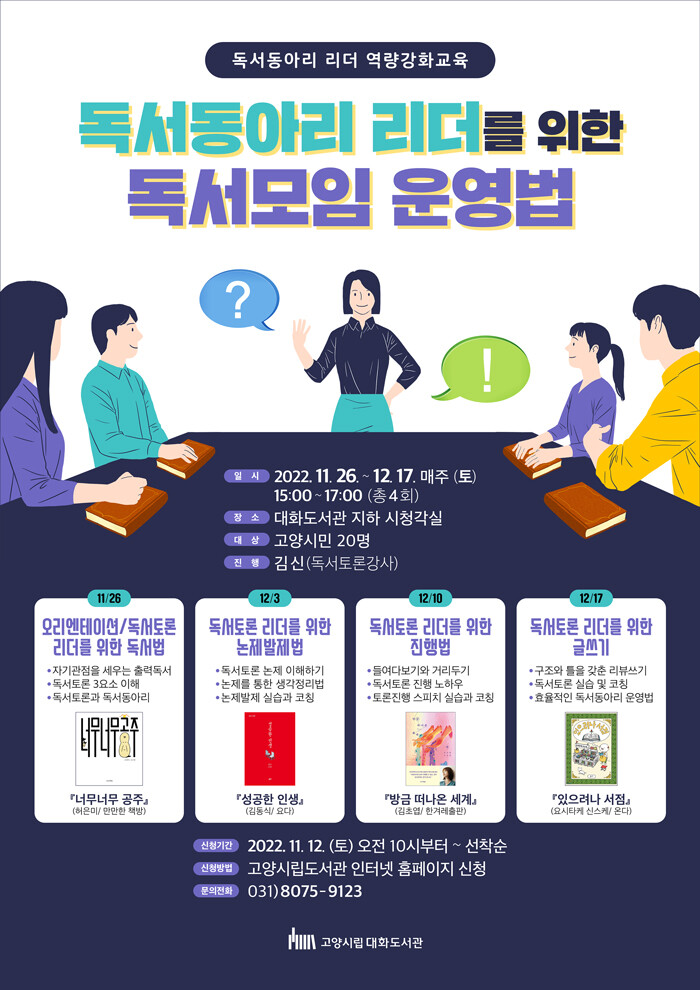 [로컬세계 = 이영원 기자]경기 고양특례시(시장 이동환) 대화도서관이 오는 26일부터 12월 17일까지 독서동아리 리더 양성 프로그램 '독서동아리 리더를 위한 책모임 운영하는 법'을 운영한다.