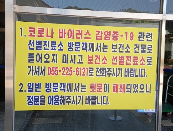 ▲창원시 진해보건소 전면 유리창에 선별진료소 이용에 대한 안내문구가 부착돼 있다. 코로나19 유증상자 박양 외조부 김씨 제공 |